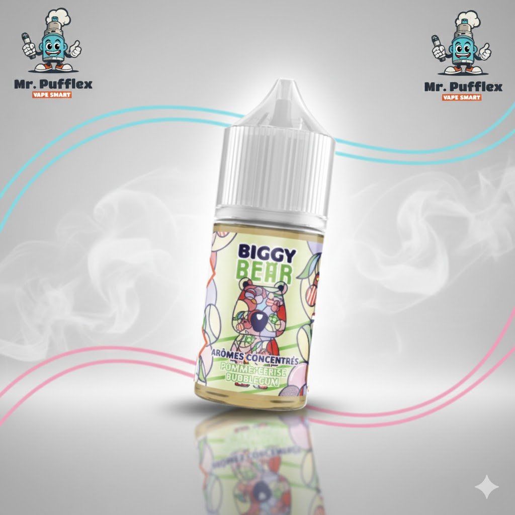 Un mélange de Pomme et de Cerise acidulé englobé par un Bubble Gum sucré. Le tout préparé par le Biggy Bear en format Concentré 30mL.